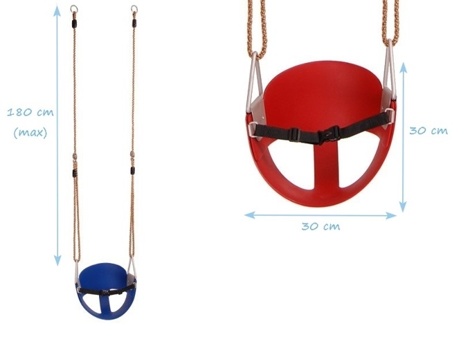 Гибкие полузакрытые качели с ремешком и надежными защелками. Сиденья крепятся на веревках с помощью металлических карабинов. Прочный мягкий пластик за счет эластичности не создает дискомфорта для малыша. Ручки моделью не предусмотрены, но в данном случае они и не нужны. Цвет можно выбрать любой, он долго останется насыщенным.