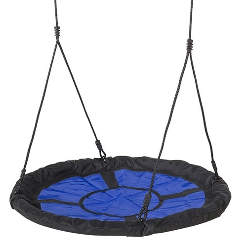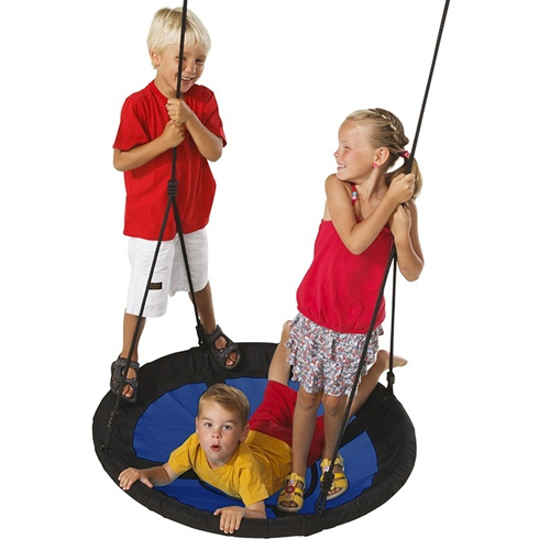 Качели «Фиеста» с круглой открытой платформой. Крепятся на балке прочными синтетическими веревками диаметром 10 мм в одной или двух точках. Модель многоместная, одновременно могут качаться несколько детей. Платформа прочная, не боится влаги и не выгорает на солнце.